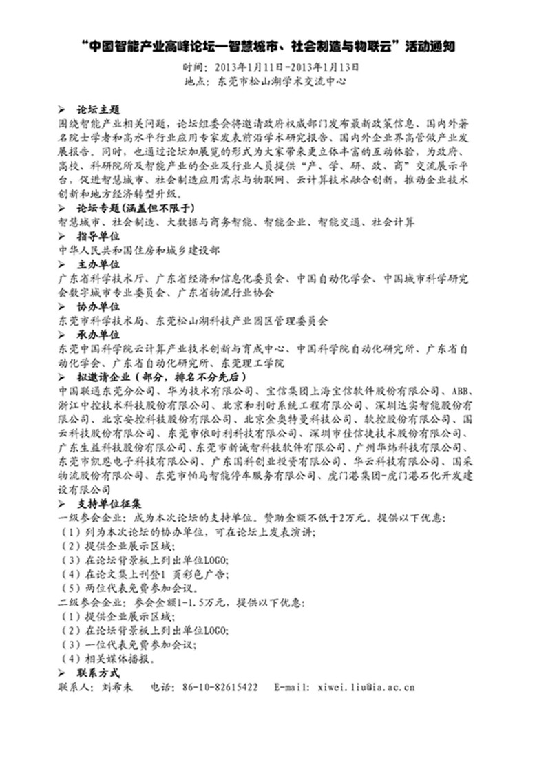 “中国智能产业高峰论坛—智慧城市、社会制造与物联云”活动通知