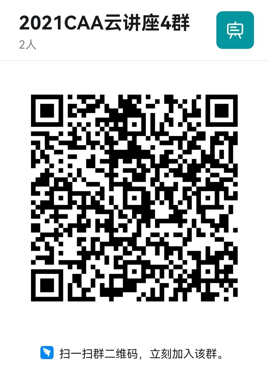 2、打开钉钉扫一扫,扫描下方二维码加入2021CAA云讲座4群(如您之前已经加入云讲座群,则不必再加入该群,届时将多群联播,任何一个群均可观看直播)。