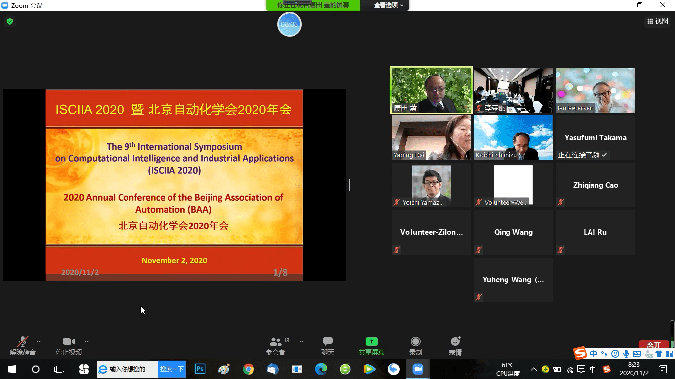 第9届国际计算智能与工业应用研讨会(The 9th International Symposium on Computational Intelligence and Industrial Applications, ISCIIA 2020)暨2020年度北京自动化学会学术年会于2020年11月1至2日在北京西苑饭店成功举行。会议由北京自动化学会、北京理工大学、国际模糊系统协会(IFSA)、日本模糊论与智能信息学学会(SOFT)、日本学术振兴会(JSPS)等机构主办,由日本富士技术出版有限公司协办,并得到了中国科协和北京市科协的支持。受疫情影响,会议采用了线上和线下混合办会模式,中国、日本、加拿大、澳大利亚、英国等国家的近200位学者参与了本次会议,围绕计算智能及应用的主题进行了广泛的交流与探讨。在物联网、云计算和大数据等新兴领域的推动下,计算智能作为实现智能化的重要技术被推到了学术界和产业界的前沿。本届会议旨在汇聚全球在计算智能等相关领域研究者和从业者进行成果展示和学术交流。
