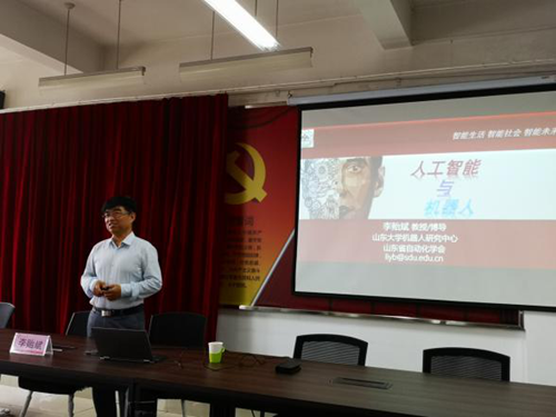 与会专家先后到山东华盛中天机械集团有限公司、山东钰耀弘圣智能科技有限公司实地考察,并在临沂大学自动化与电气工程学院进行报告交流。山东省自动化学会理事长李贻斌教授,分别为临沂市的机关企事业干部和高层次技术人才、临沂大学控制相关学科的师生,作了“人工智能与机器人”专题报告。报告后,围绕智慧农业设备、智能医康设备技术等企业创新领域的发展需求,围绕新工科背景下的学科建设以及校企技术协同与人才培养合作,进行了深入交流。