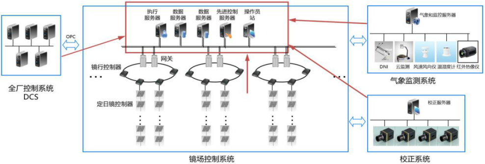 光热电站采用分层式网络架构,如图6所示,DCS系统用于整个电厂的控制,而镜场控制系统则采用一种分层的网络结构,支持多达10万台日光镜,约有60万个数据点。加上常规控制系统的2万个数据点,总计达到62万个数据点,这可以覆盖超过300万平方米的聚光面积,年发电量可达10亿度电。此外,系统还包括气象检测和校正系统。气象检测系统用于制定云策略,以最大程度地提高太阳光的利用效率,并监测大风等恶劣天气条件,确保设备安全运行。校正系统采用自动标定技术,使安装过程中的精度要求降低,而后使用校正软件和数码相机来实现自动校准。这种自动校准技术大幅提高了校正过程的效率,避免了大量的人工干预。
